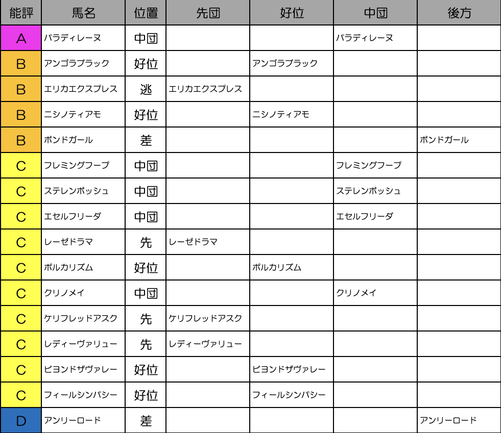 エリカエクスプレス、レーゼドラマ、ケリフレッドアスク、レディヴァリューと逃げたい馬はそれなりに揃った印象。ペース流れて差しが決まる可能性が高いか。