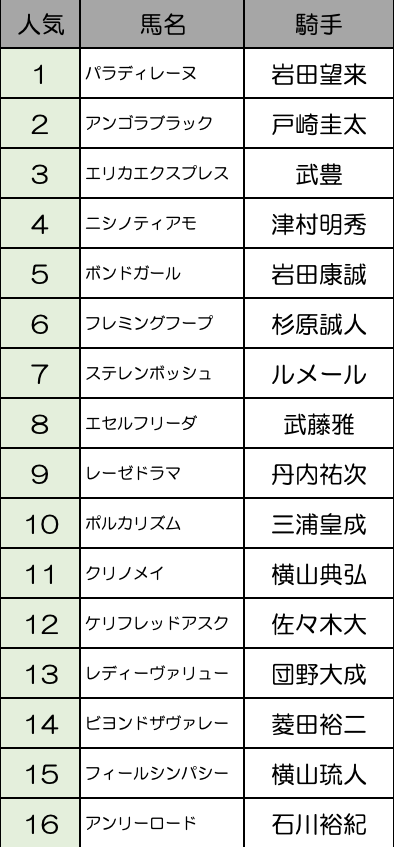 今年はなかなかメンバーが揃った印象。パラディレーヌ、アンゴラブラック、エリカエクスプレス、ニシノティアモあたりのどれかが1番人気になりそうです。