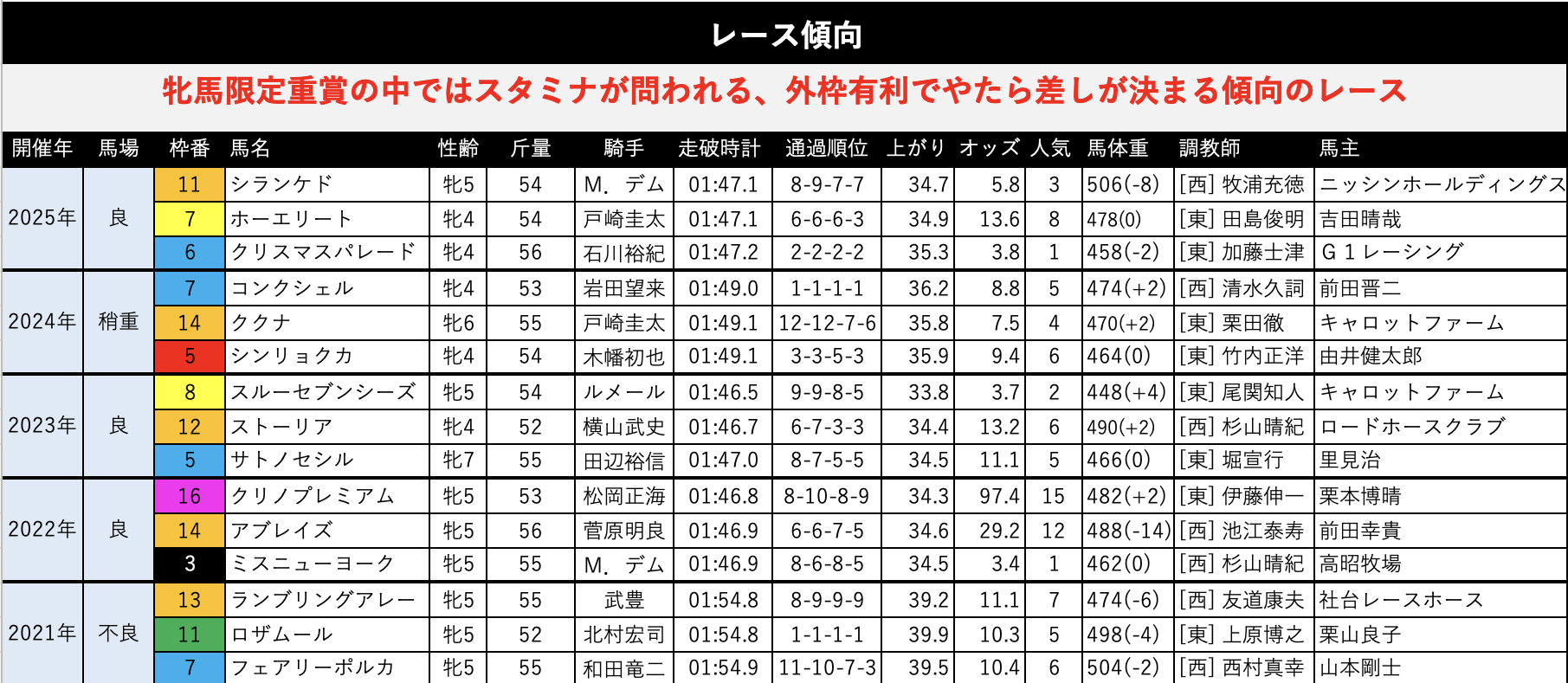 穴を開けやすい馬というよりは、差し有利のレースなので、穴馬も差し勢から輩出されることが多いです。
