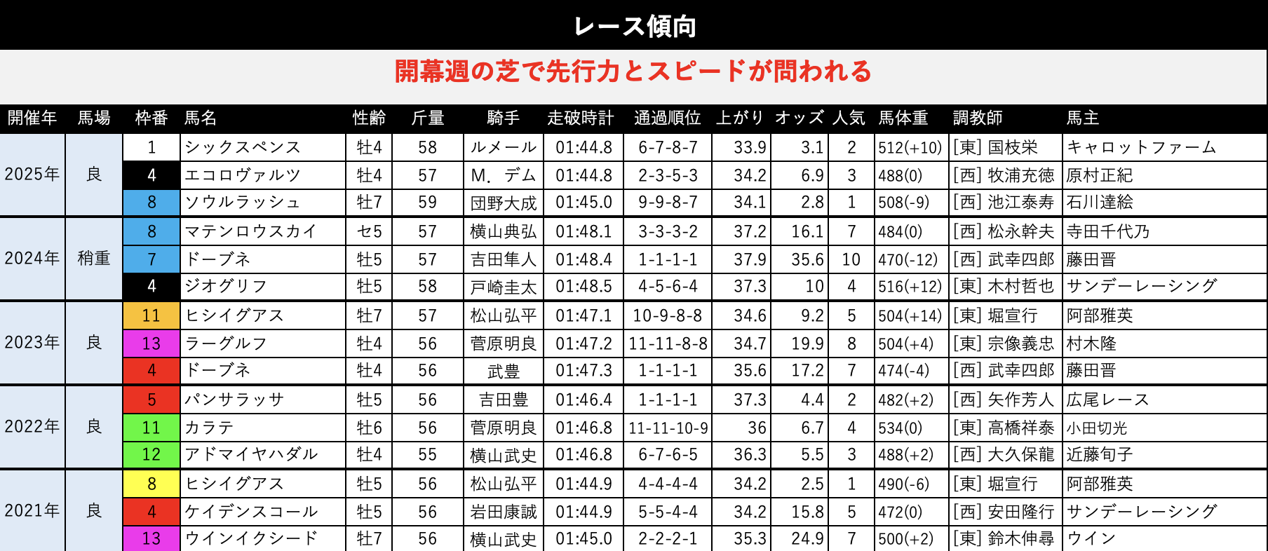 直近の開催5年で7番人気以下で好走した5頭のうち4頭は4コーナーを2番手以内に通過した馬でした。開幕週のスピードレースでとにかく前に行ける馬を狙いたいです。