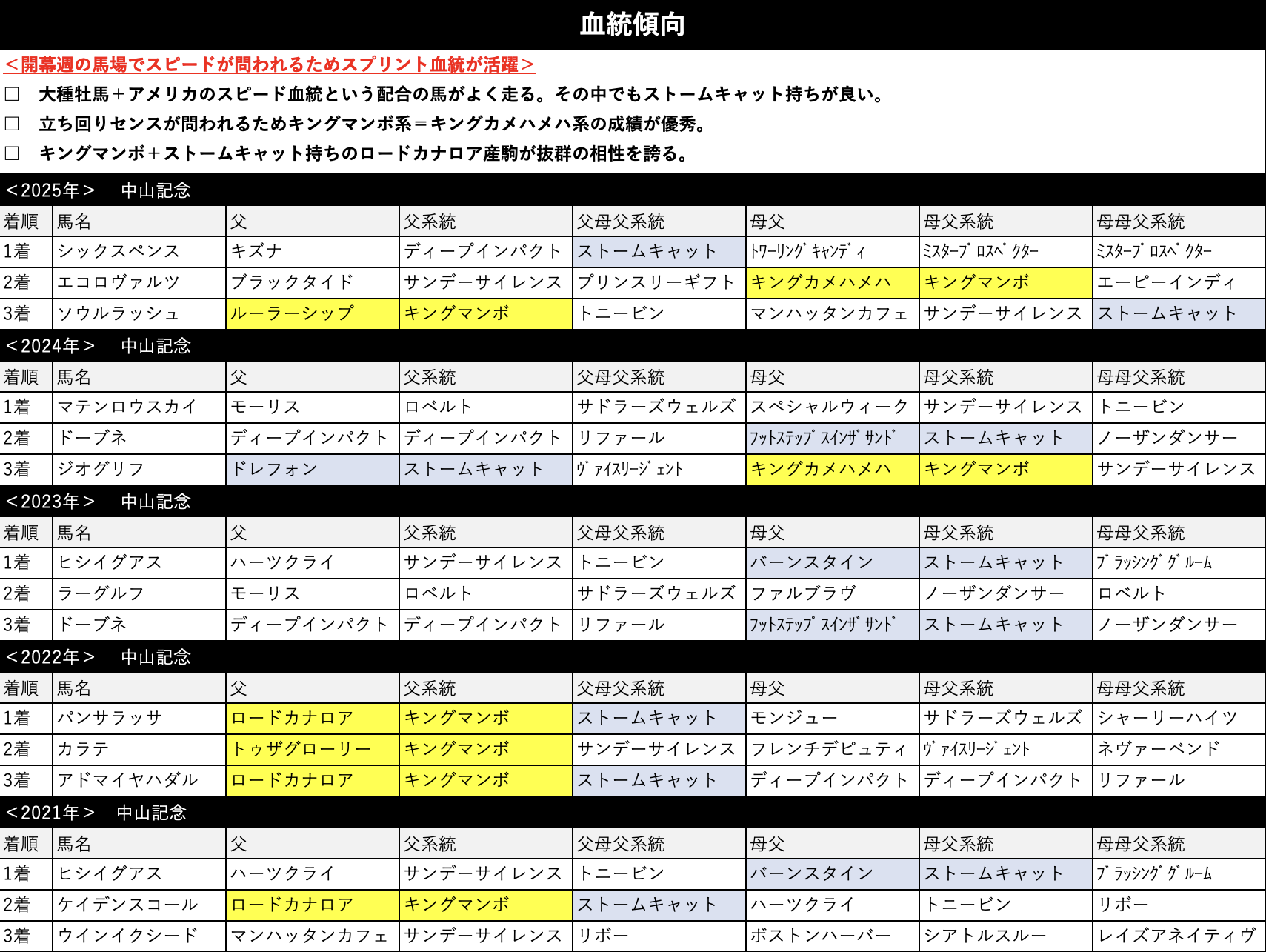 開幕週で淀みないペースで流れるレースということでスプリント血統が走りやすいレース。ロードカナロア産駒やストームキャット系のようなアメリカのスピード血統が走りやすい。