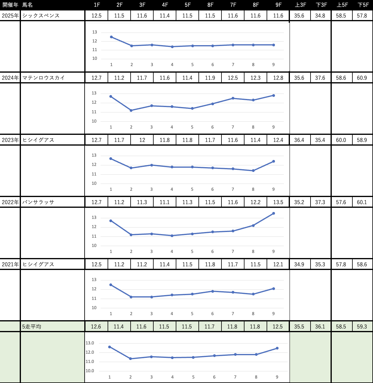 開幕週の馬場でスピードを活かす馬が多いために前半から中盤ラップが全く弛まないのが特徴。中盤で息を入れる部分がないため、ゆったり進めることに慣れている中距離馬よりも速い流れに慣れている短距離馬の方が走りやすいレースです。