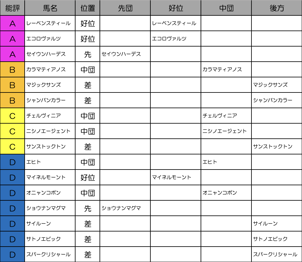 今年は上位人気と下位人気に能力差がありそうで、上位人気馬の取捨が重要になるか。レーベンスティールとエコロヴァルツは内枠を引けば特に危険とは言えないですし、カラマティアノスも一気の相手強化になるとはいえデータ的に絶好な4歳で前走1着馬なので軽視しすぎるのも良くない。