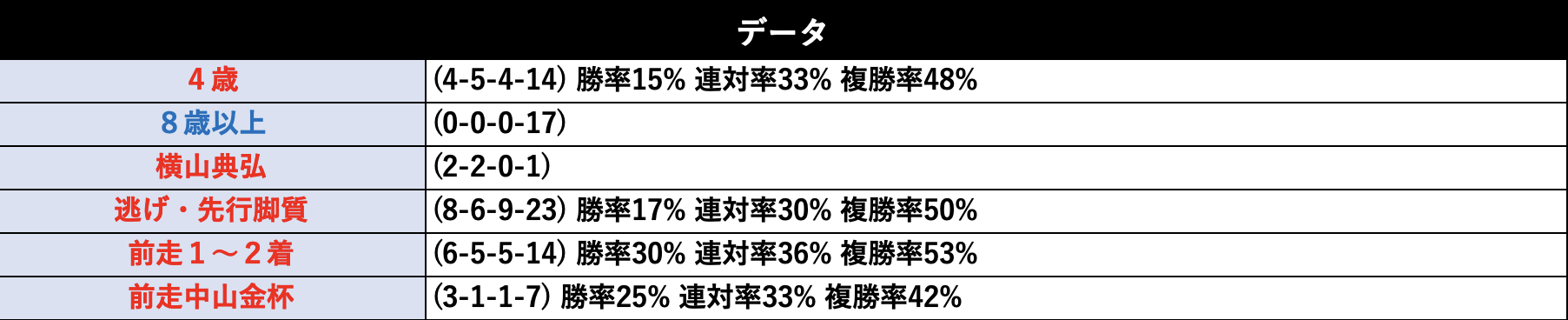 今年は上位人気と下位人気に能力差がありそうで、上位人気馬の取捨が重要になるか。レーベンスティールとエコロヴァルツは内枠を引けば特に危険とは言えないですし、カラマティアノスも一気の相手強化になるとはいえデータ的に絶好な4歳で前走1着馬なので軽視しすぎるのも良くない。