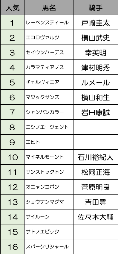 枠順次第ではありますが、レーベンスティール、エコロヴァルツ、セイウンハーデスの3強オッズになりそう。少し開いて4番人気にカラマティアノスという感じになるんじゃないでしょうか。