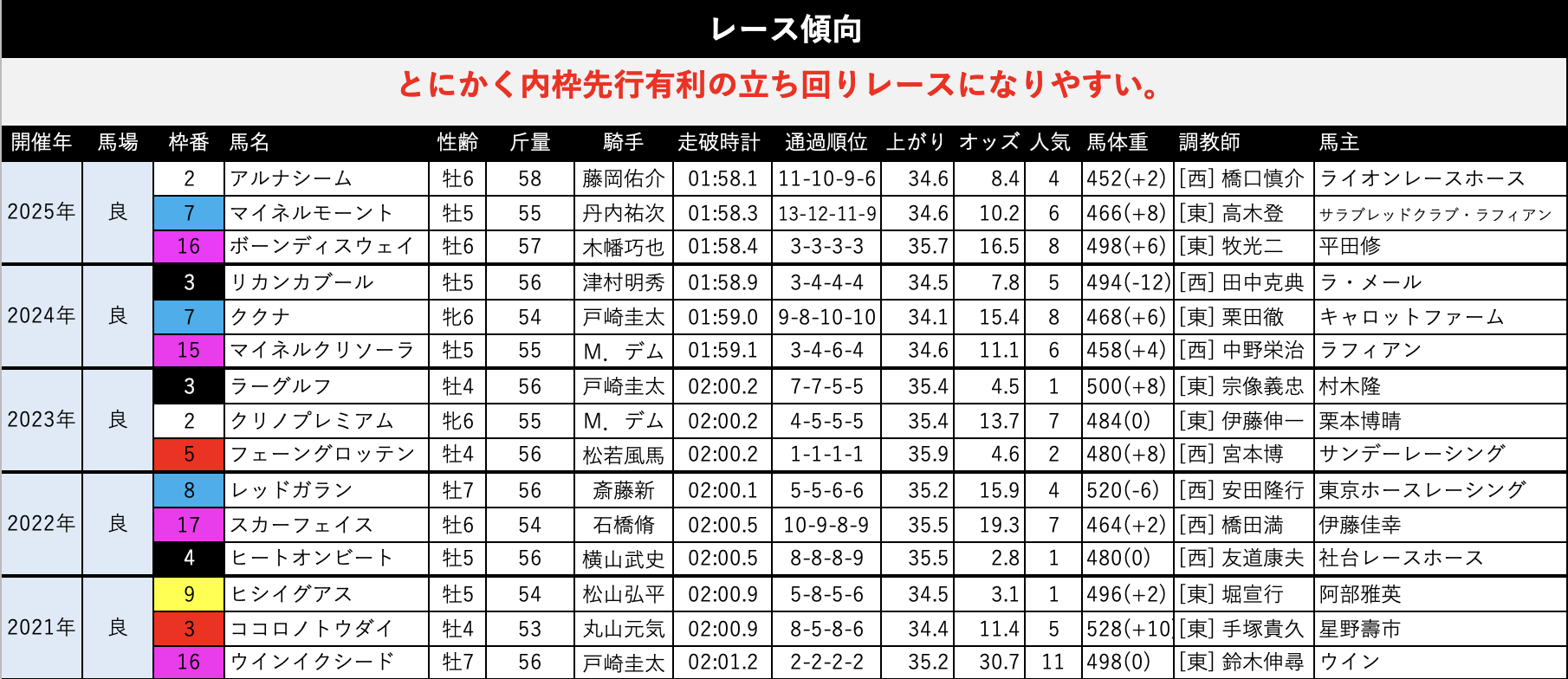 こうしてデータを見ても、明らかに内枠の馬が優勢の結果になっています。
