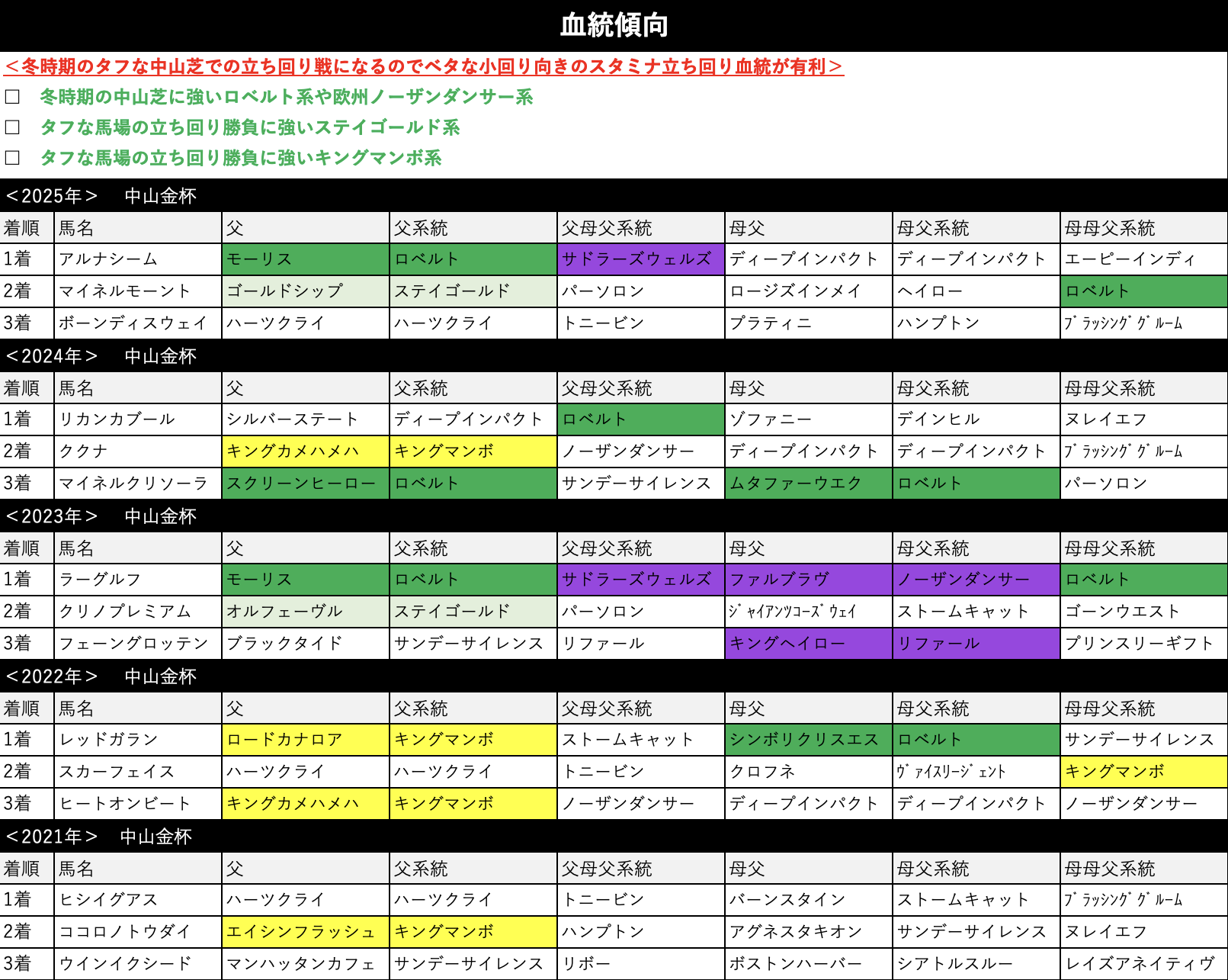冬時期の中山芝2000mで行われるレースということもあってスタミナを補完する欧州血統の活躍が顕著。ロベルト系の好走が非常に目立ちますし、サドラーズウェルズ系を代表とする欧州ノーザンダンサー系の活躍も目立ちます。