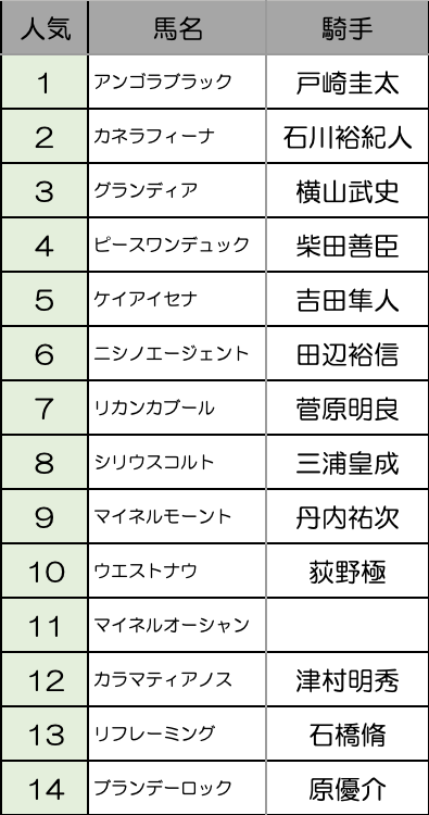 このレースは枠順次第でオッズが変わるのでなかなか難しいですが、アンゴラブラック、カネラフィーナあたりが人気の中心じゃないでしょうか。