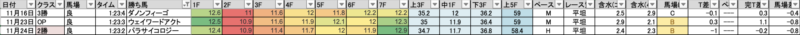 これを見れば縦比較で走破時計やレースラップがどれくらい優秀なのか把握できますし、予想の際にこれを見ればどの馬が強いレースを戦ってきたのかが一目瞭然です。