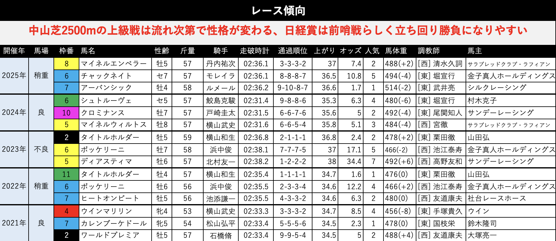 小回りの中山芝2500mで開催されるレースでなおかつ前哨戦ということもあって速いペースで流れることは稀。ゆったりしたペースからのロンスパ戦になって、ロスなく立ち回ってきた馬の好走が目立っています。