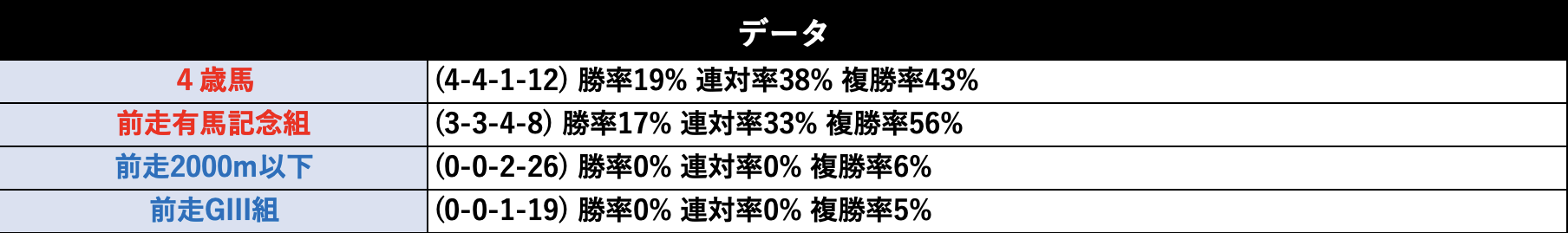 同じく中山芝2500mで開催される有馬記念組の成績が優秀。なかなか2000m以下から出走してくる馬は馬券に絡めていません。