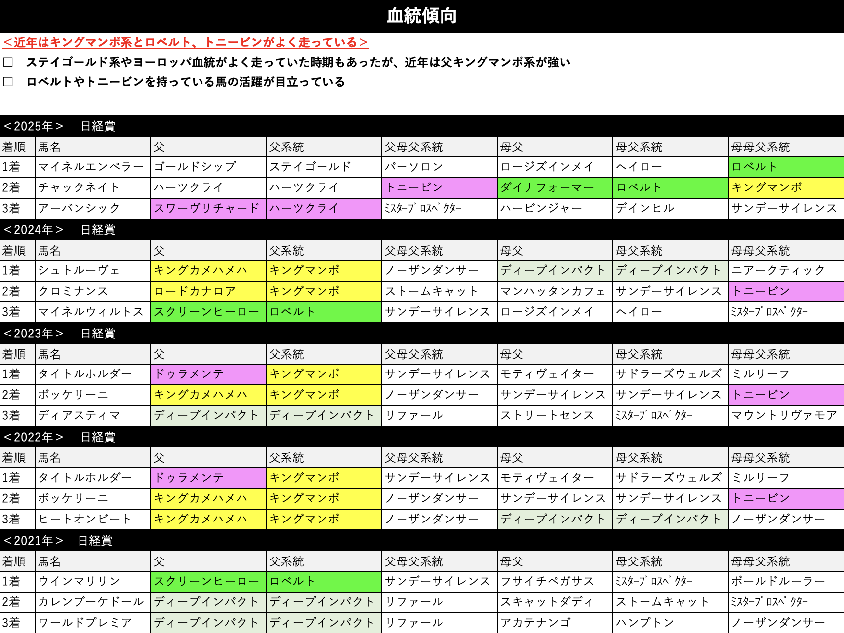 以前はステイゴールド系の好走が目立っていましたが、近年はキングマンボ系の好走が目立っている感じ。ロベルトやトニービンを持っている馬の活躍も目立ちます。