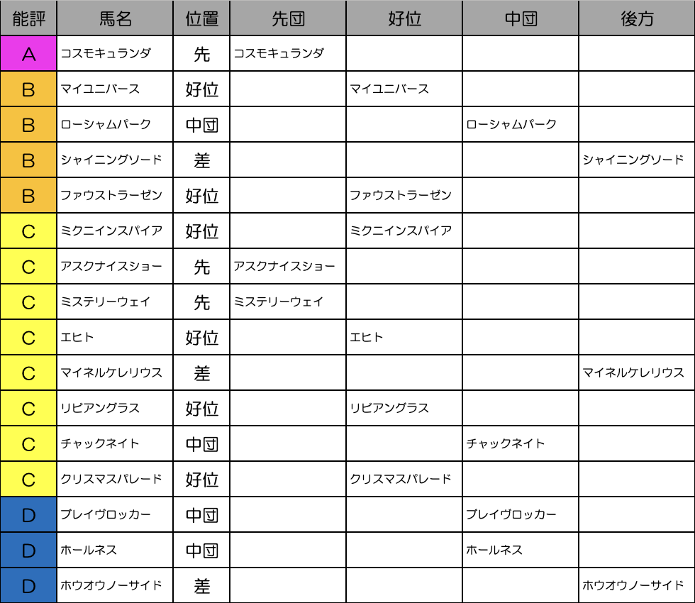 有馬記念2着のコスモキュランダが1番人気でしょう。おそらく2番人気もマイユニバースになるんじゃないでしょうか。ミクニインスパイア、ローシャムパーク、シャイニングソードあたりも人気になりそうです。