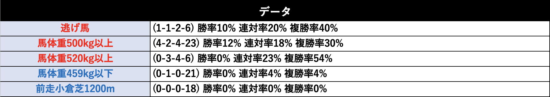 スピードとパワーが問われる中山芝1200mで行われるレースということで馬体重別の成績が顕著。馬体重が重ければ重いほど好走率が上がりますし、軽量馬の活躍は全くありません。