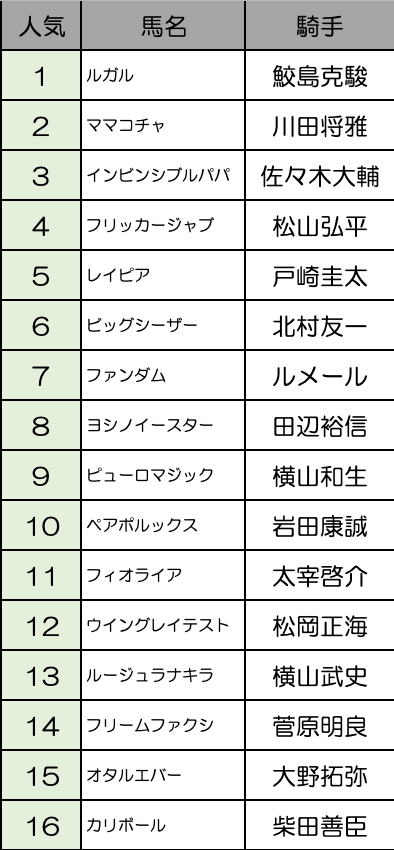 ここに来て復活傾向のルガルが1番人気か。ママコチャ、インビンシブルパパ、フリッカージャブあたりが2、3、4番人気になりそう。さすがにnetkeibaの想定オッズほどファンダムは人気しないでしょう。