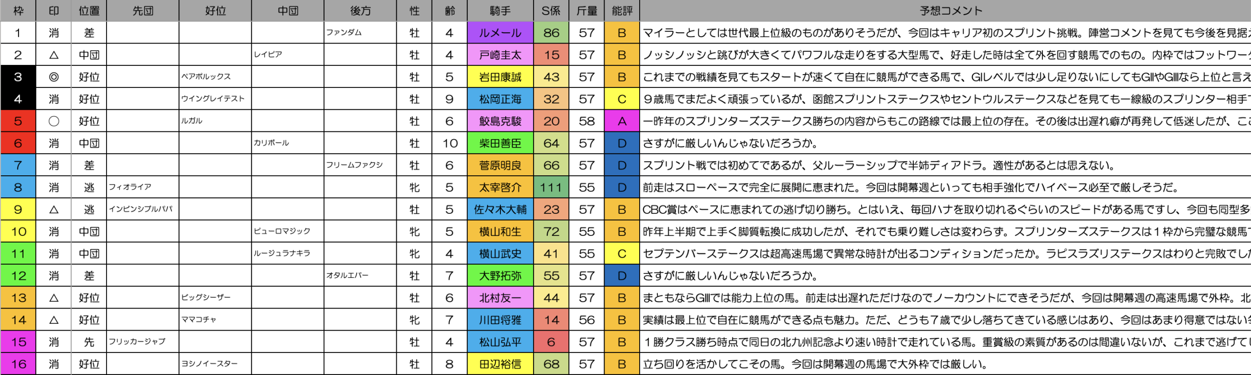 フィオライア、インビンシブルパパ、フリッカージャブなど徹底先行タイプがズラリと揃った印象。開幕週の馬場でかなりのハイペースになりそうです。