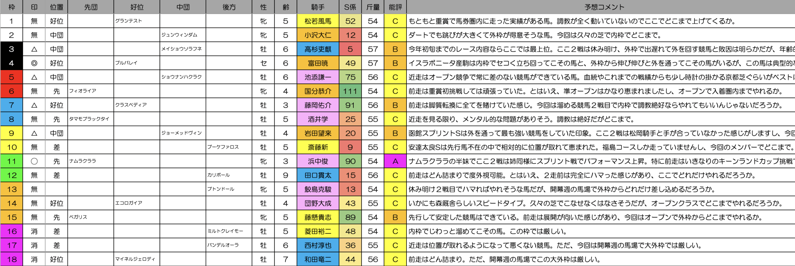 クラスペディアが今回も控える競馬を示唆しているので、おそらくフィオライアかベガリスが主張する形か。どれくらい前が競り合うかはやってみないとわからないところ。展開に幅は持たせつつ、内枠の好位ぐらいにいる馬が一番向くんじゃないだろうか。
