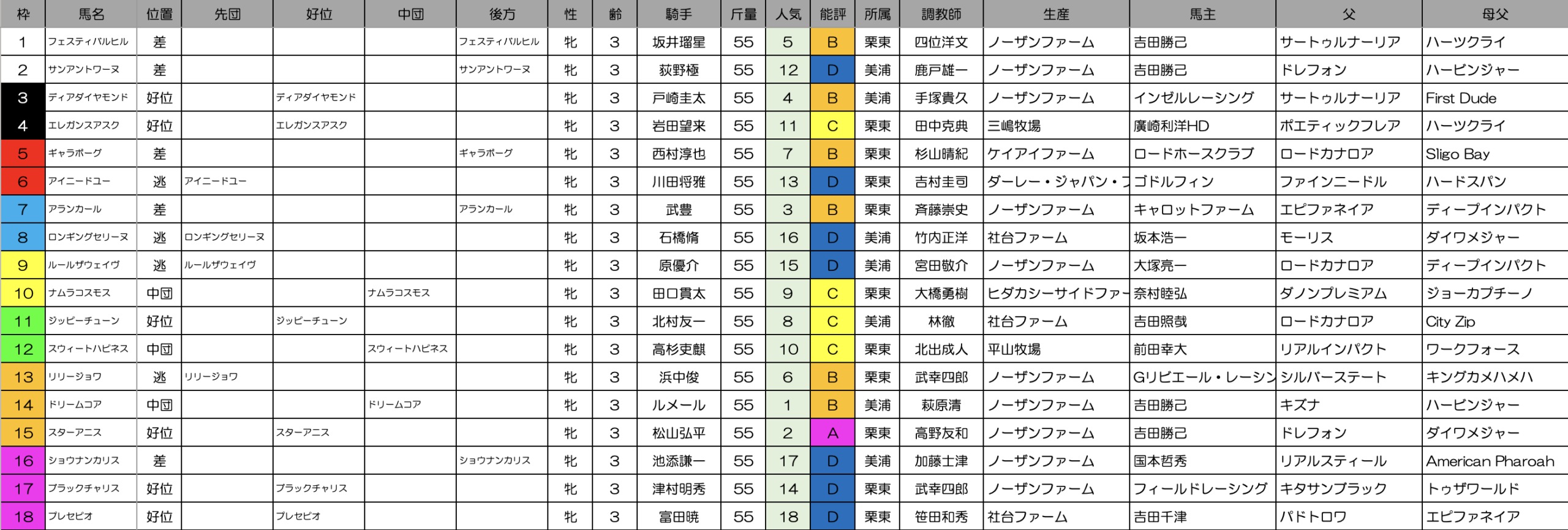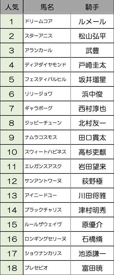 ひょっとすると枠の影響でアランカールが1、2番人気に割って入る可能性もありそう。4、5番人気はおそらくディアダイヤモンドとフェスティバルヒルが内枠ということで人気になりそうです。