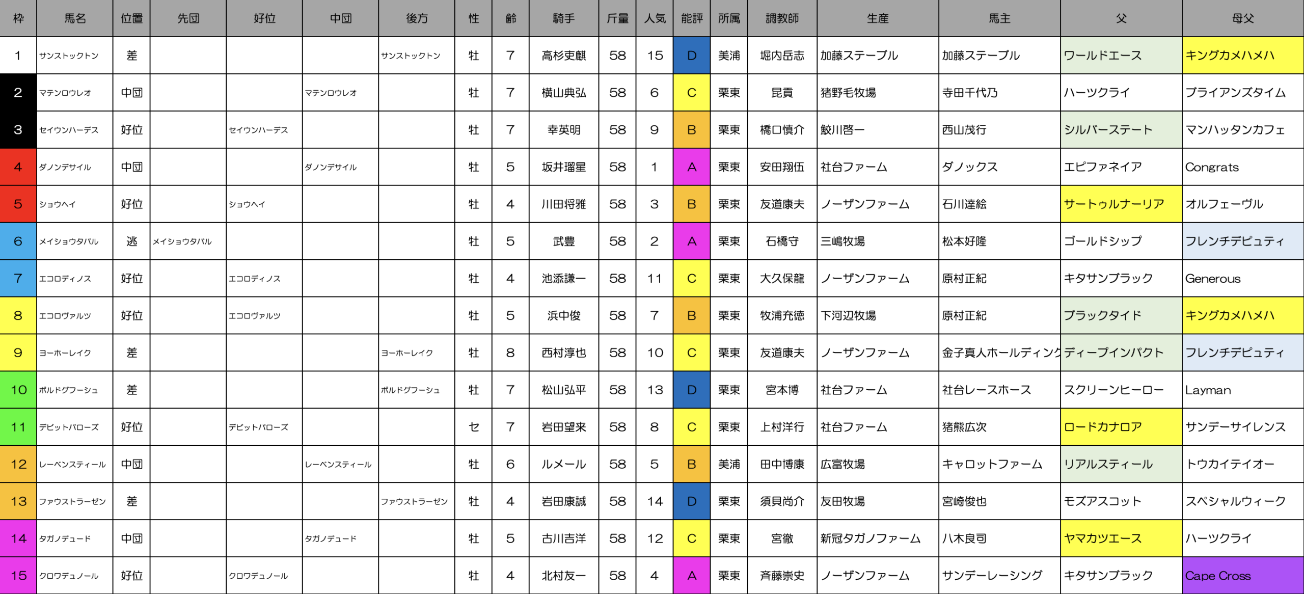 5番人気以下は難しいですねぇ。おそらくルメールがGIを2連勝しているので5番人気はレーベンスティール。6番人気は買いやすい枠を引いたマテンロウレオで、7番人気に許容範囲の枠を引いたエコロヴァルツとかになるんじゃないでしょうか。