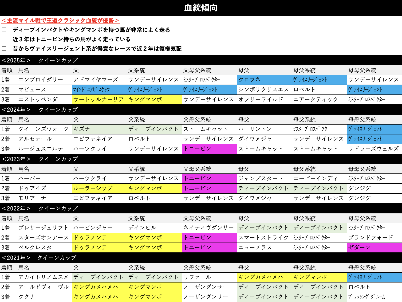 主流条件のマイル戦ということでディープインパクトやキングマンボの血を持つ馬の成績が非常に優秀。近年はトニービン持ちの馬の成績も目立っています。