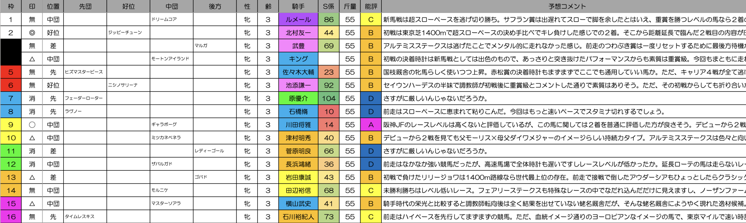 東京芝1600mで行われる3歳限定の牝馬重賞。以前はチューリップ賞の前に行われる優先出走権がない重賞ということでそこまでメンバーは揃わなかったが、最近は間隔を空けてGIに挑むのがトレンドになってきたことで、チューリップ賞よりもメンバーが揃うことが多い。今年もノーザンファーム生産の有力馬がここを使ってきてメンバーは揃った印象です。