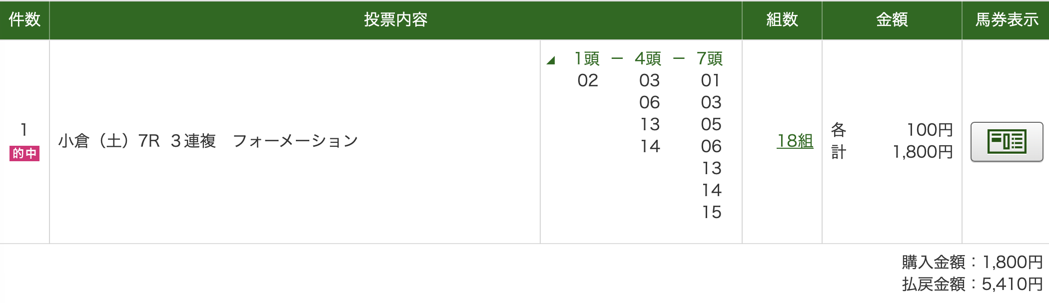 まさか単勝も三連複もここまで配当がつくとは・・・断然人気のファイアスピリットが絡んでこの配当ですよ??本当に最近のJRAのオッズってよくわからんですね。この回収率は最高でした。こういうのを2週に1回ぐらい当てていきたいです。