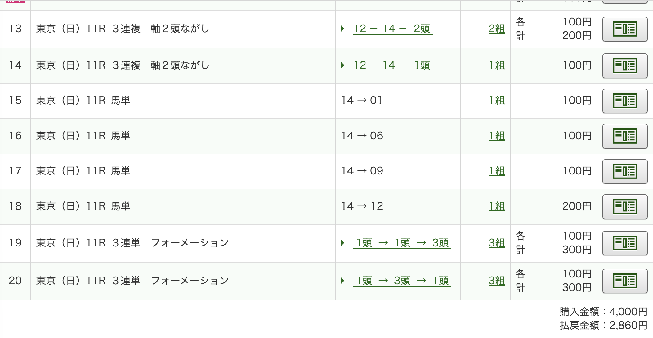 コスタノヴァがゲート出るか出ないかは運の要素も強かっただけに、まぁこれは仕方ないんじゃないでしょうか。抑え気味の馬連と三連複で少し取り返しただけでも上出来です。