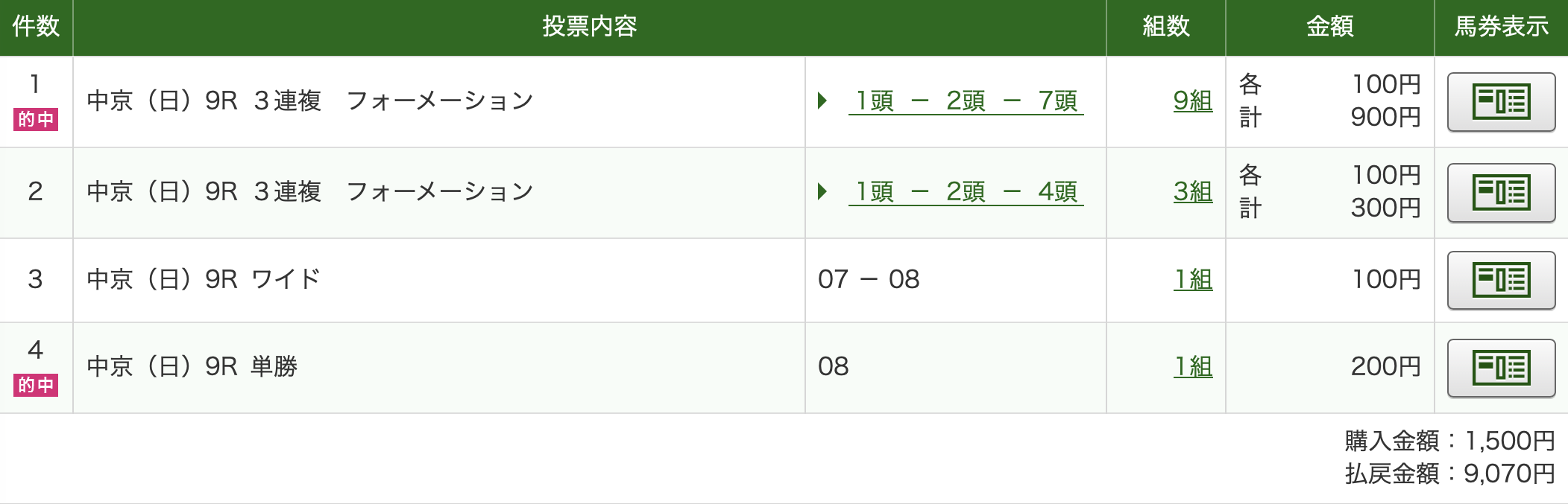 平場はそこそこ的中できたので、土曜日はマイナスでしたが日曜はトントンで終了。その平場の良い部分をキープしつつ、また翌週に向かって行こうと思います。というわけで最後に平場レースの的中予想を載せて終わりにしたいと思います。