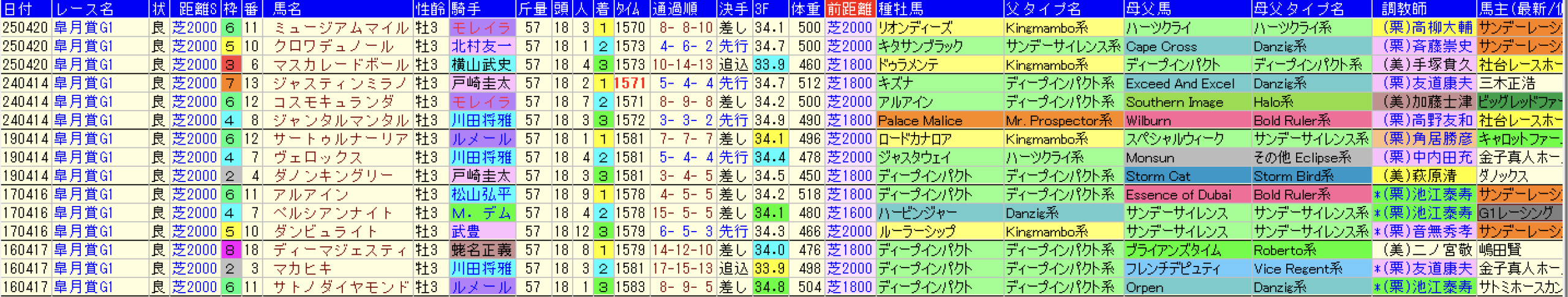 過去10年で決着時計が1分58秒台よりも早かった年の皐月賞の結果をまとめたのがコチラ。血統はディープインパクト系やキングマンボ系の成績が圧倒的で、やはり1800mやマイルでの実績がある馬が有利な傾向。そして枠順を見ても「ちょうど良い中枠」の馬の成績が目立っています。