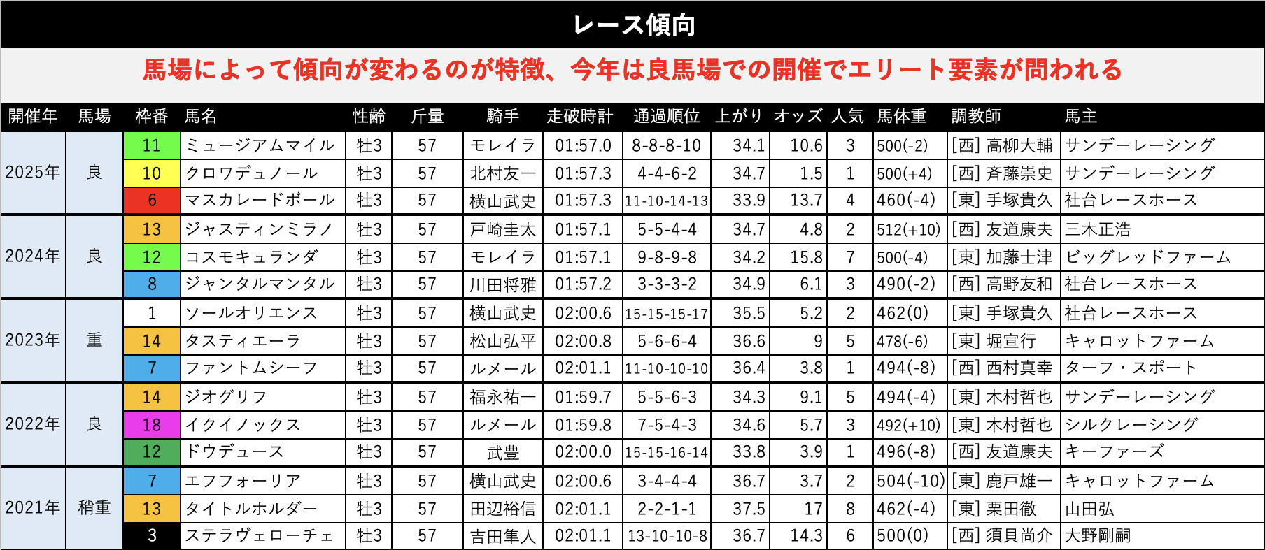 良馬場で時計の速い年は普通にクラシックレースらしく能力の絶対値や決め手の鋭さが問われてエリートタイプの馬が好走しますが、雨馬場で時計のかかる年はそんなエリートタイプの良さが発揮できない分、雑草タイプのスタミナが活きるレースになりやすいです。