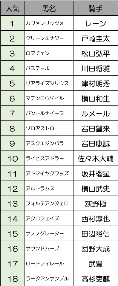 超大混戦オッズになりそう。一応はカヴァレリッツォが1番人気だと思いますが、グリーンエナジー、ロブチェン、バステール、リアライズシリウス、マテンロウゲイル、パントルナイーフ、ゾロアストロ、アスクエジンバラ、ライヒスアドラーぐらいまでは単勝10倍前後にひしめくような恐ろしい混戦オッズになりそうな感じがします。