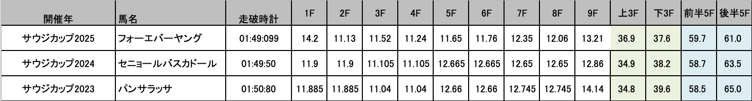 一昨年はサウジクラウンが前半1000m=58.7、2023年はパンサラッサが前半1000m=58.6という恐ろしい超ハイペースで逃げて凄まじい消耗戦に。2022年も3-4ハロン目のところで急激にペースアップして、ここでテーオーケインズが全くついていけずで脱落しました。この3年を見ても日本ではなかなか見たことがないぐらいなハイラップ戦になると考えて良さそうです。