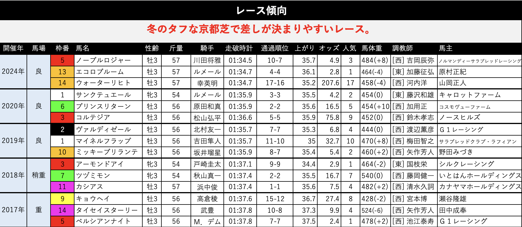 最近は京都競馬場の改修の影響もあってほとんど京都コースで開催されていませんが、この冬時期の京都芝は改修前と改修後でそこまで大きな変化はなさそう。総じて言えるのはタフな馬場でヨーロピアンな適性が問われて差しが決まるということでしょう。直近の京都開催の5年を見ても逃げ馬の連対はゼロで、中団ぐらいから差してきた馬の好走が目立ちます。