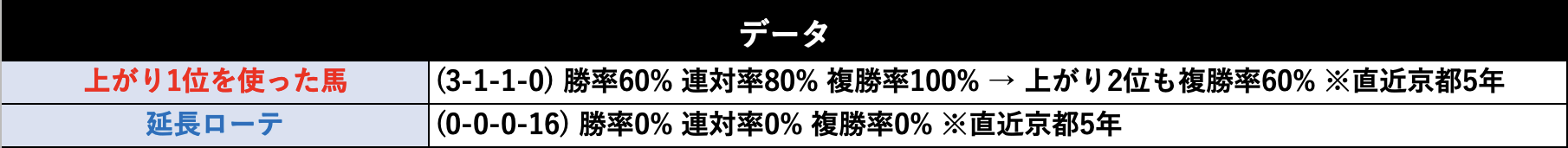 タフな馬場で末脚を活かせる馬が強いレース。上がり1位を使えた馬の成績はパーフェクトですし、スタミナに欠ける延長ローテの馬の成績は最悪です。