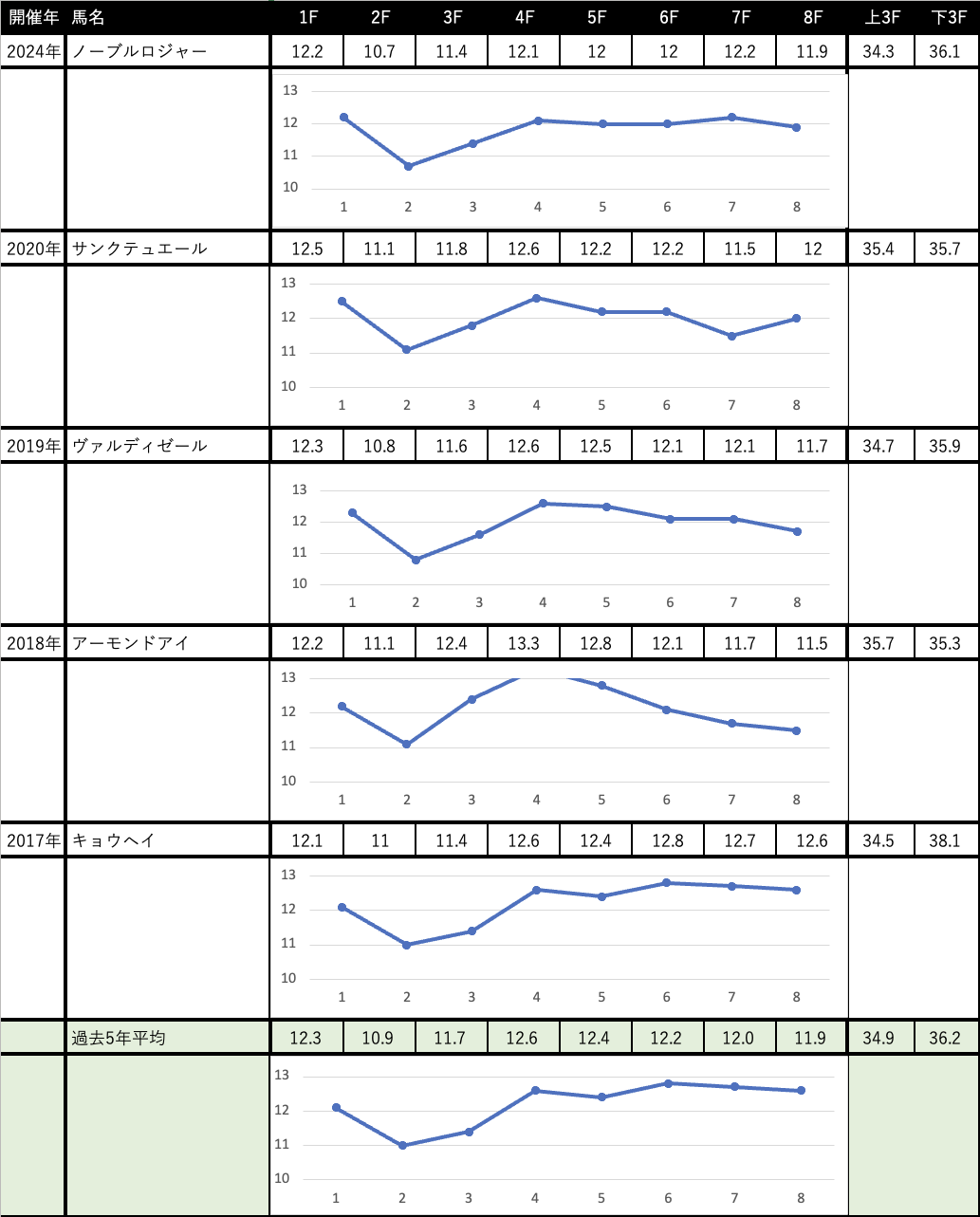 短距離でスピードを活かしてきた馬も出走してくるからか、直近の京都開催はペースが速くなることが多い。レース上がりも大体36秒前後はかかるので、上がり34秒台後半でも差し込んでこれます。