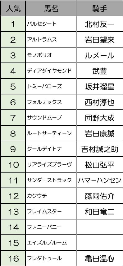 今のファンのレベルを考えると、京都2歳ステークスのことは完全無視でバルシートが人気になりそう。アルトラムスやモノポリオも当然人気でしょう。