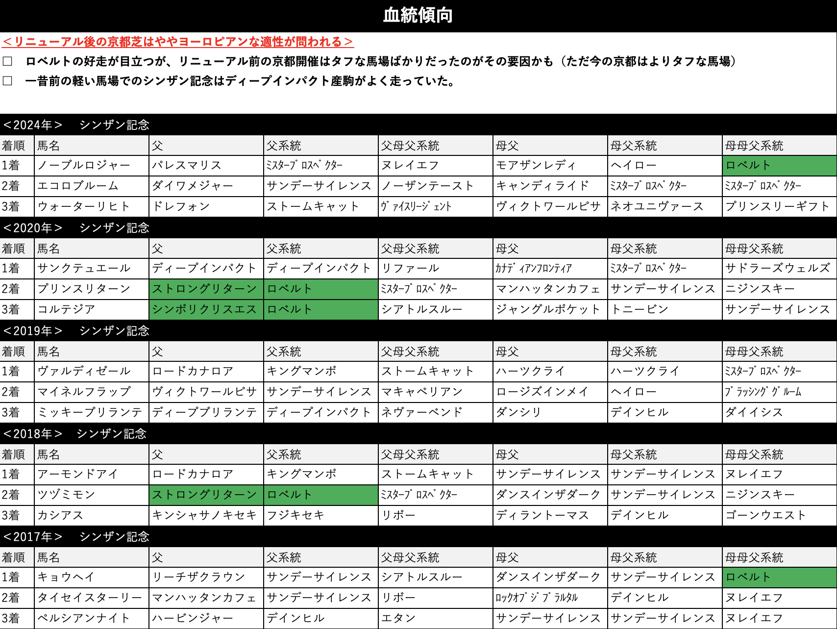 もともとは京都コースでディープインパクト産駒の独壇場のようなレースでしたが、2010年代後半からはタフな馬場になることが多く、ヨーロピアンなスタミナ血統が好走傾向。特にロベルトを持っている馬がよく走っています。