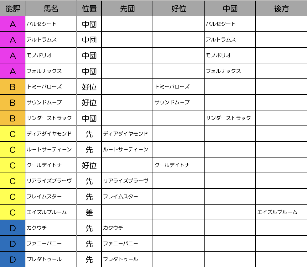 これを見れば縦比較で走破時計やレースラップがどれくらい優秀なのか把握できますし、予想の際にこれを見ればどの馬が強いレースを戦ってきたのかが一目瞭然です。