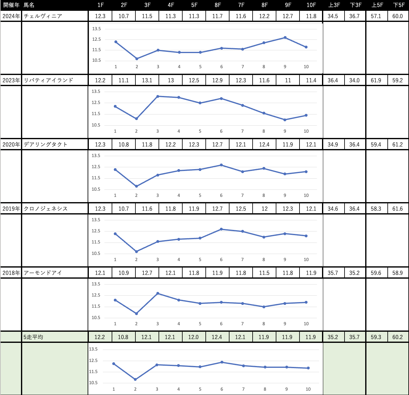 一昨年は例外的な超スローペースからの瞬発戦に。その一昨年をカウントしても近5年の平均前半ペースは1000m=59.3。内回りコースで前傾ラップのハイペースになりやすいレースで、最後は上がりがかかるのでイメージよりも差しが決まりやすい傾向です。