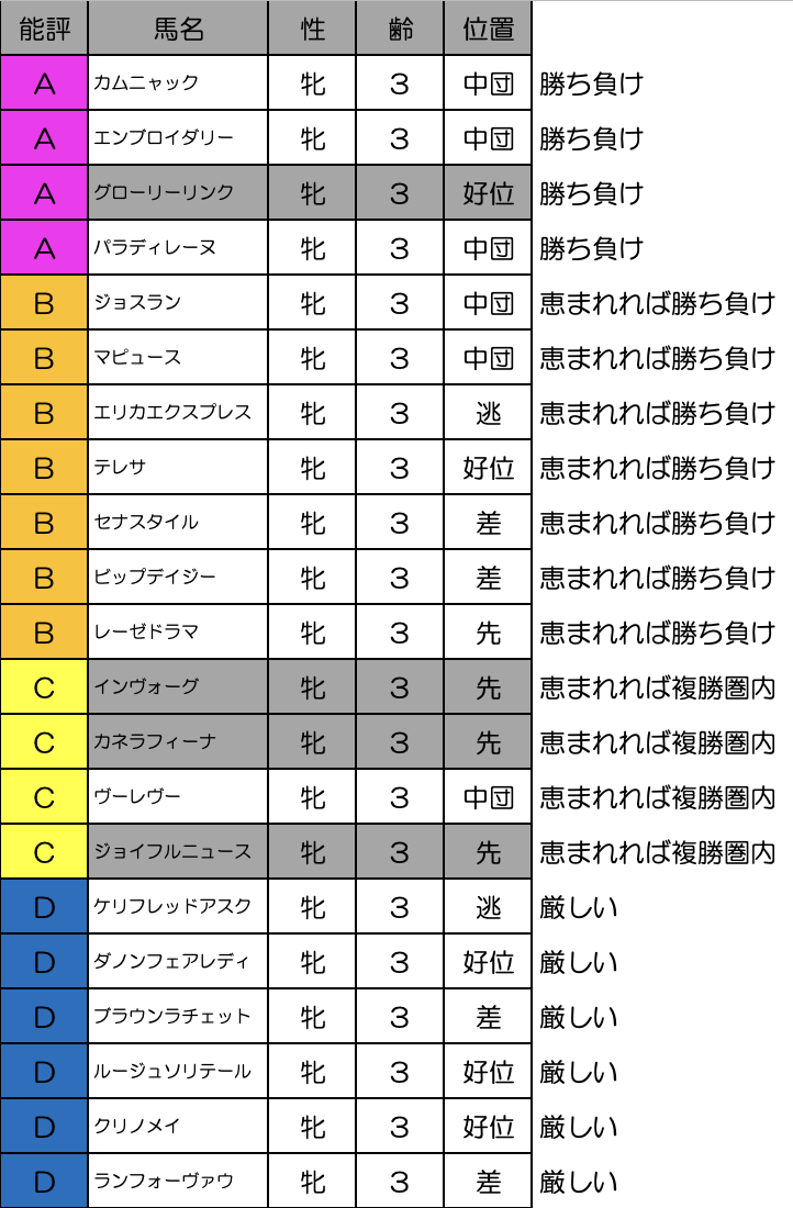 これを見れば縦比較で走破時計やレースラップがどれくらい優秀なのか把握できますし、予想の際にこれを見ればどの馬が強いレースを戦ってきたのかが一目瞭然です。
