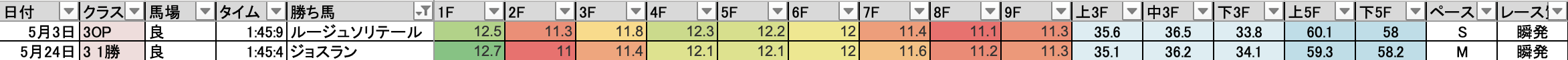 これを見れば縦比較で走破時計やレースラップがどれくらい優秀なのか把握できますし、予想の際にこれを見ればどの馬が強いレースを戦ってきたのかが一目瞭然です。