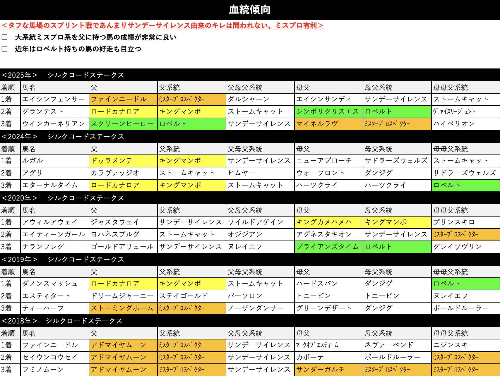 昔からミスプロ系の馬の好走が目立つレースで、最近はそのミスプロ系の一種でもあるキングマンボの系統がよく走っています。