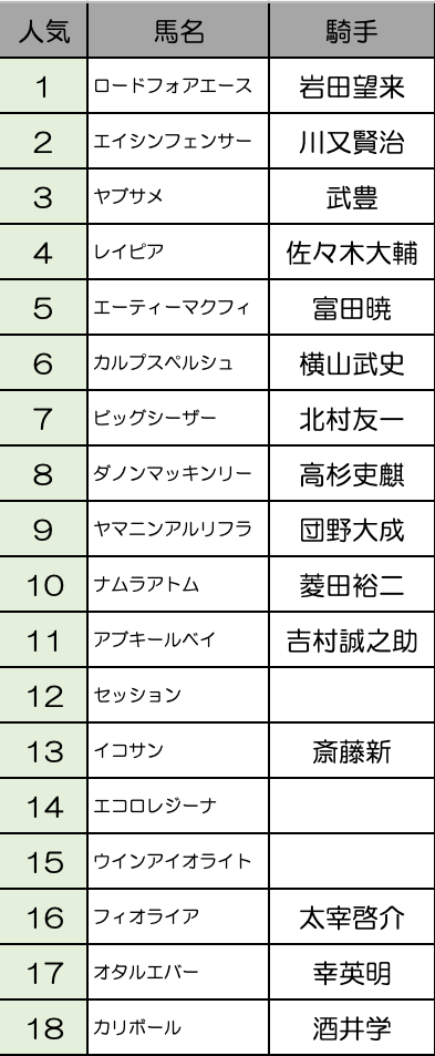 前走が圧巻のパフォーマンスだったロードフォアエースが1番人気か。netkeibaの想定オッズよりもエイシンフェンサーは人気になりそうで、ヤブサメ、レイピアあたりが続きそう。斤量面もあってエーティーマクフィは人気にならないと思います。