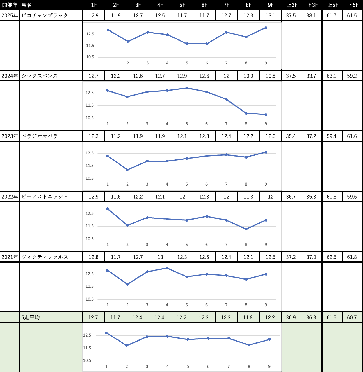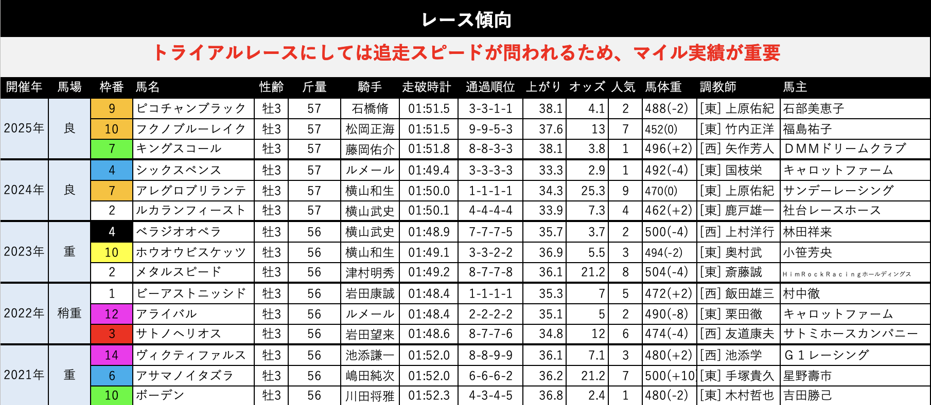 過去5年ベースで見ると2021年と2023年と2025年が道悪馬場ですし、2024年が極端な超スローペース戦なのであんまり参考にならないかも。基本はそこそこペースは流れる傾向です。