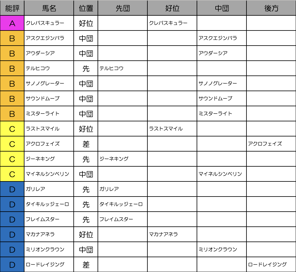 これを見れば縦比較で走破時計やレースラップがどれくらい優秀なのか把握できますし、予想の際にこれを見ればどの馬が強いレースを戦ってきたのかが一目瞭然です。