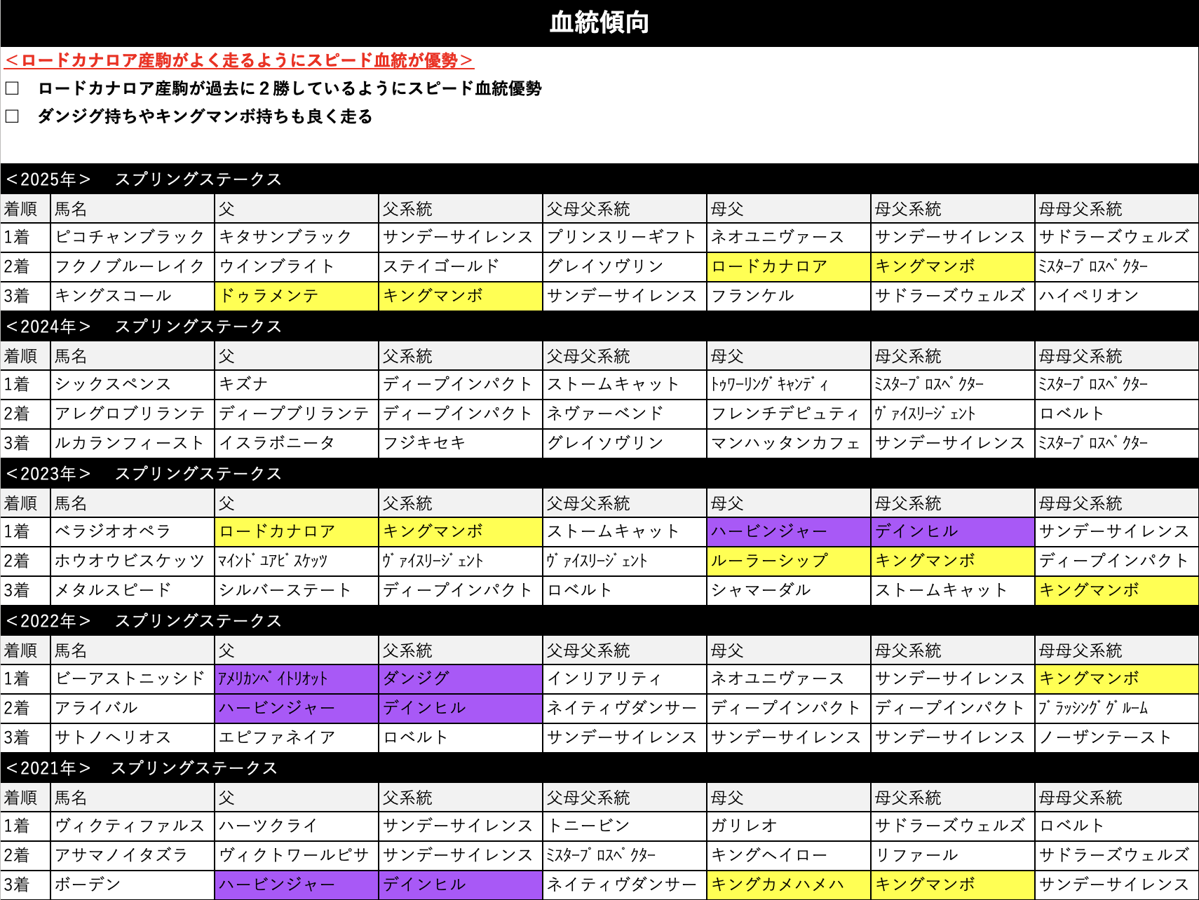 血統傾向もこれまで述べてきた通り。スプリント血統のロードカナロア産駒が過去に2勝していますし、それ以外にもスピードあふれる血統の活躍が目立っています。それ以外だとダンジグ系やキングマンボ系の活躍が目立ちますね。