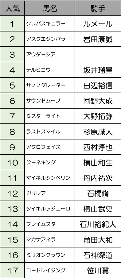 ここは2戦2勝のクレパスキュラーが断然人気になりそう。2番人気もアスクエジンバラで、3番人気以下は混戦になるんじゃないだろうか。