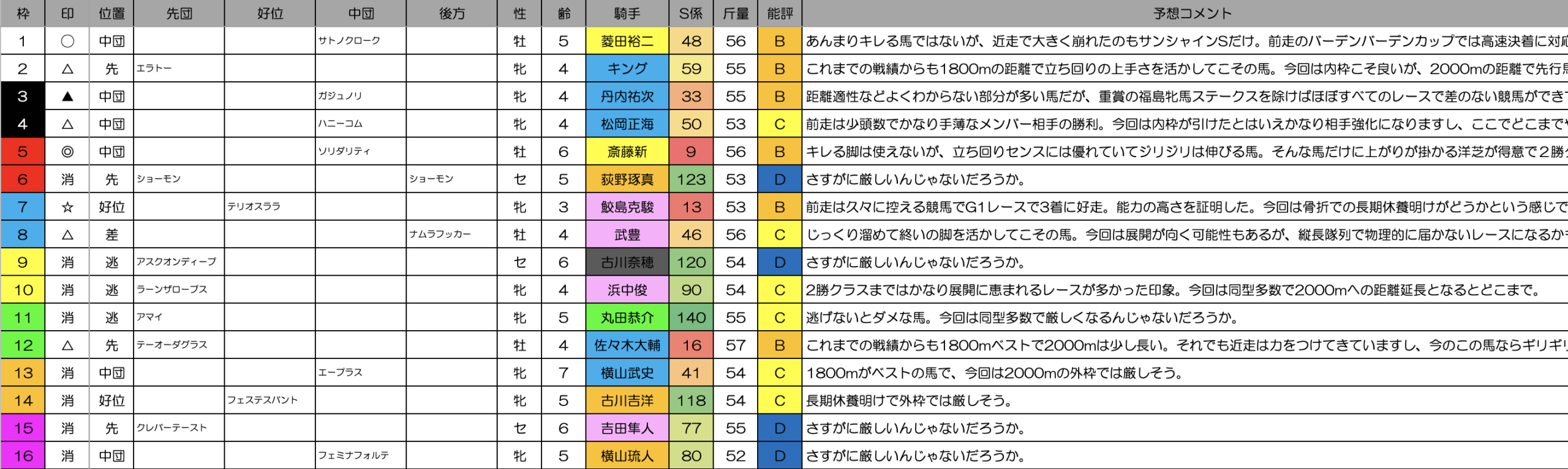 ショーモン、アスクオンディープ、ラーンザロープス、アマイ、クレバーテーストなど、主張しそうな馬多いメンバー構成。かなり速い流れになりそうで、インをロスなく立ち回れる差し馬が有利になると見ます。