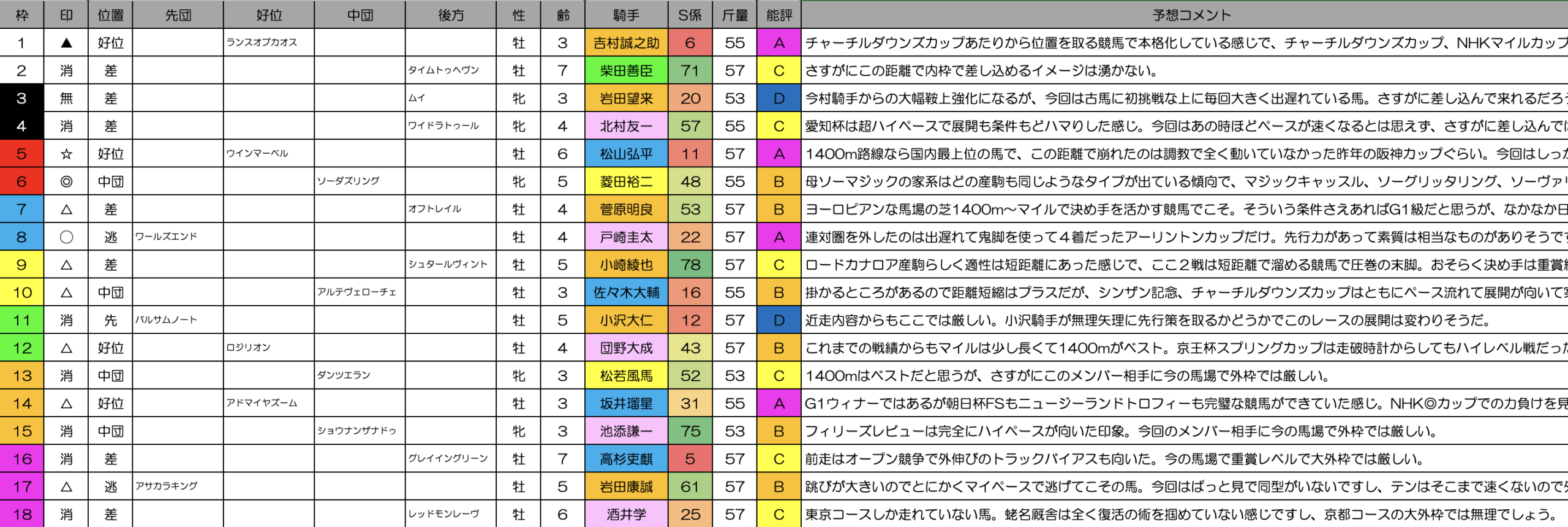 G1ウィナーではあるが朝日杯FSもニュージーランドトロフィーも完璧な競馬ができていた感じ。NHK◎カップでの力負けを見ても立ち回りが上手い早熟タイプで相対的に走れていた感じもあるんじゃないだろうか。特に短縮がプラスとも思えませんし、今回は初の古馬挑戦で外枠で1番人気なら少し評価は落とす。