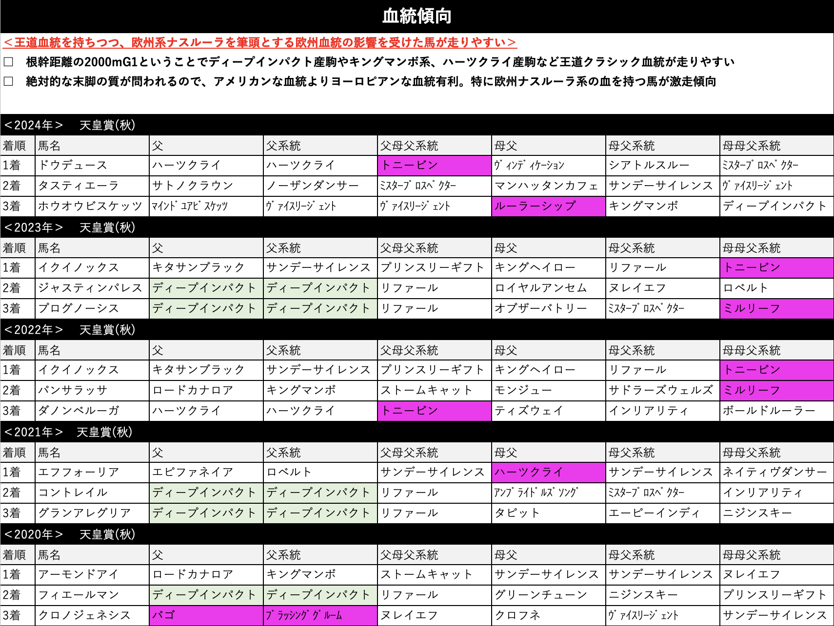 特に欧州血統の中でもナスルーラ系の血を持つ馬の成績が抜群。天皇賞(秋)は昔からトニービンがよく走るレースでしたが、最近はもっと欧州血統、特にナスルーラの血を持つ馬が強調できるレースになってきているんじゃないでしょうか。